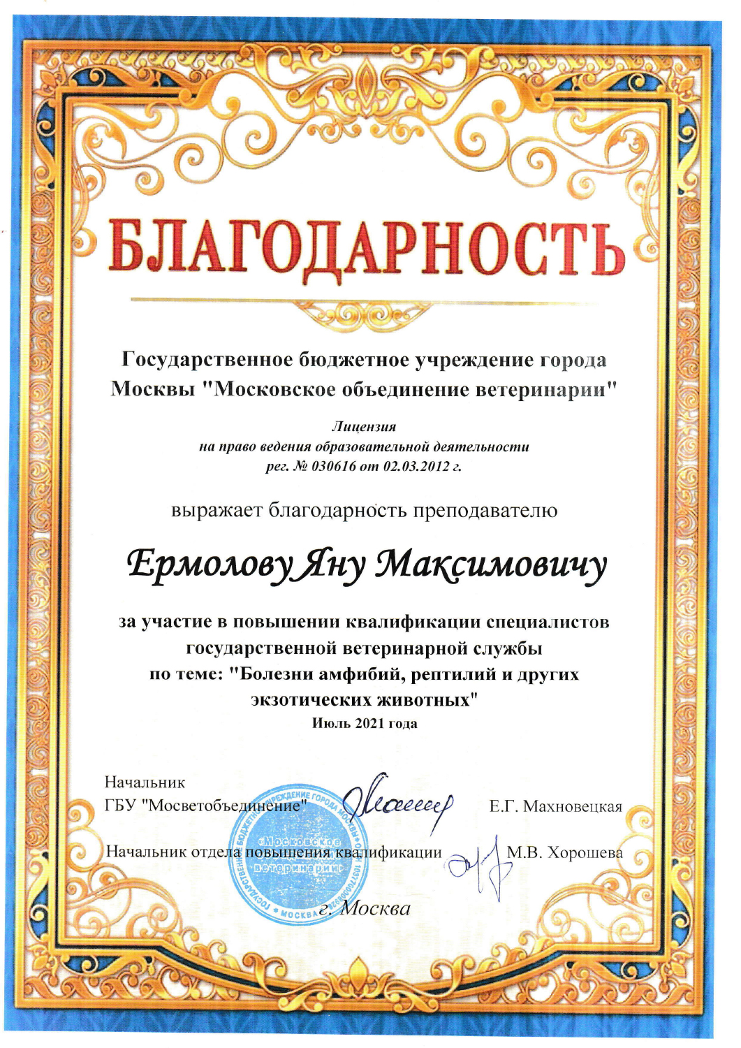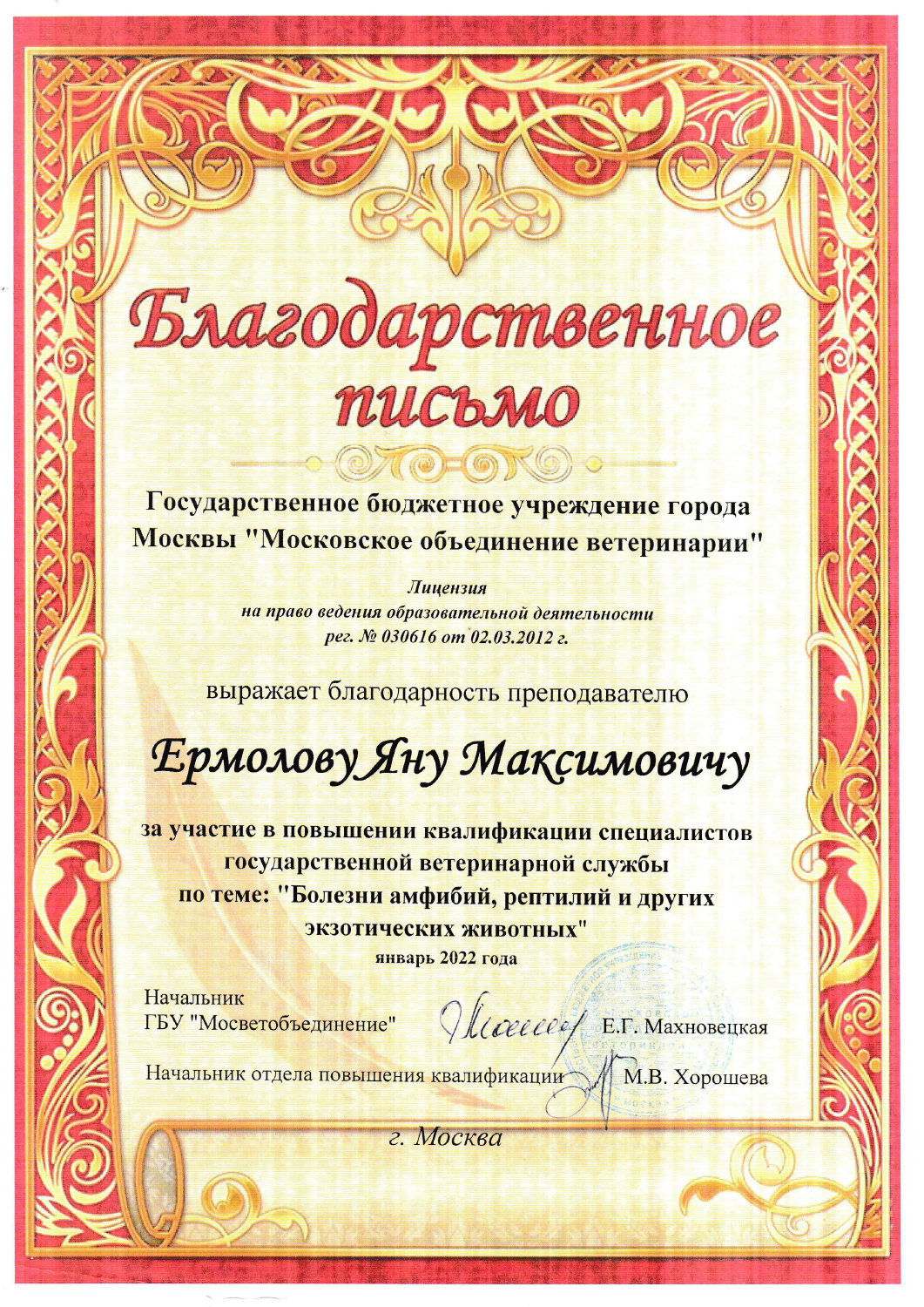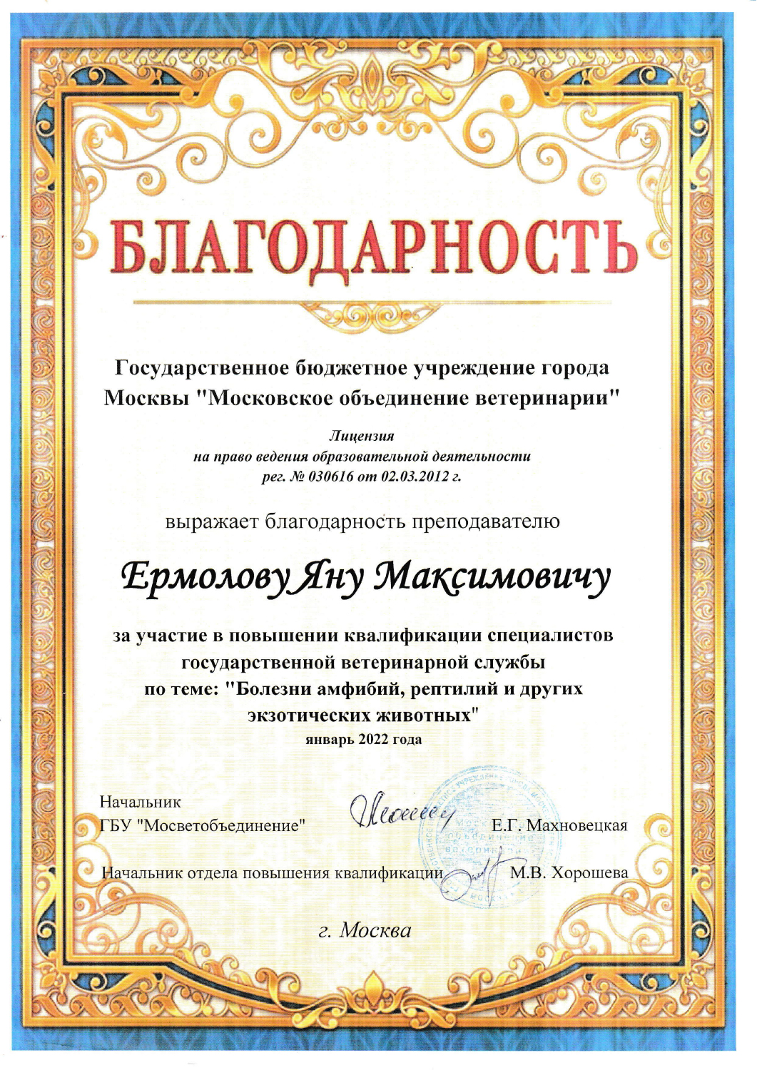 - 2024 г. — ветеринарный врач, Мосветобъединение, ГБУ;