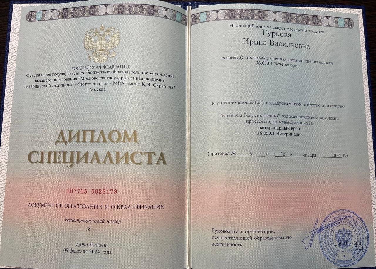 - 2018 – 2024 гг. - - ФГБОУ высшего образования Московская государственная академия ветеринарной медицины и биотехнологии - МВА имени К.И. Скрябина (квалификация- ветеринарный врач).