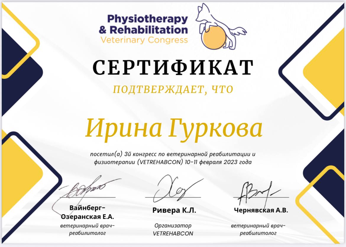 - 2023 г. - участник 3-го Конгресса по ветеринарной реабилитации и физиотерапии (VETREHABCON).