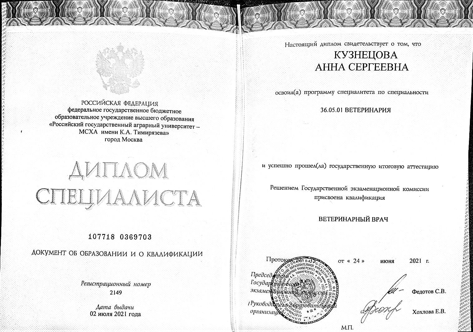 - 2019-2021 гг. - ассистент ветеринарного врача, СВК «Свой доктор» Черемушки;