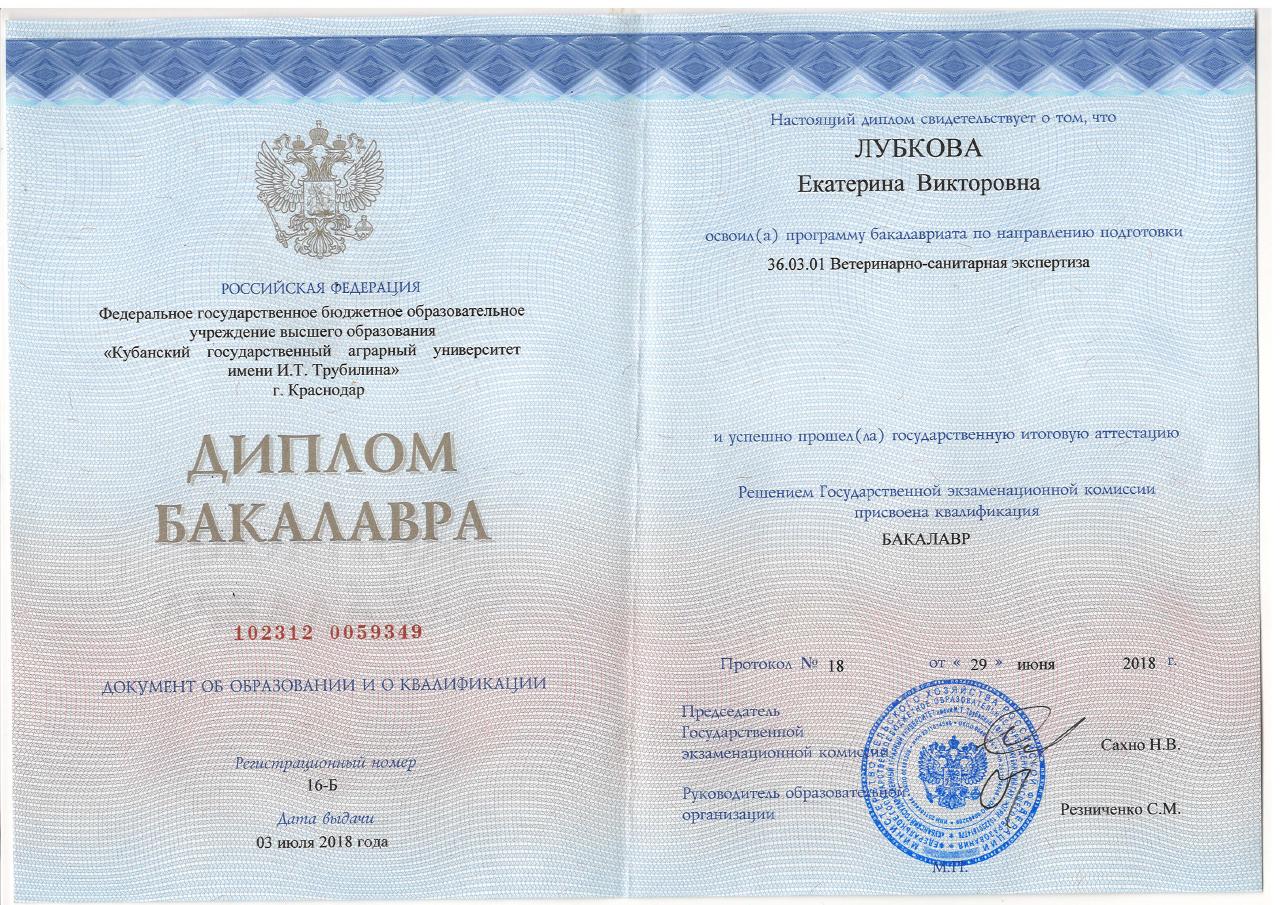 - 2014-2018 гг. - Кубанский Государственный Аграрный Университет им И.Т. Трубилина- факультет ветеринарной медицины, направление «ветеринарно-санитарная экспертиза» (бакалавриат);