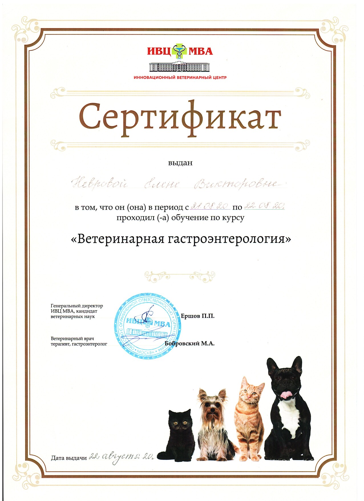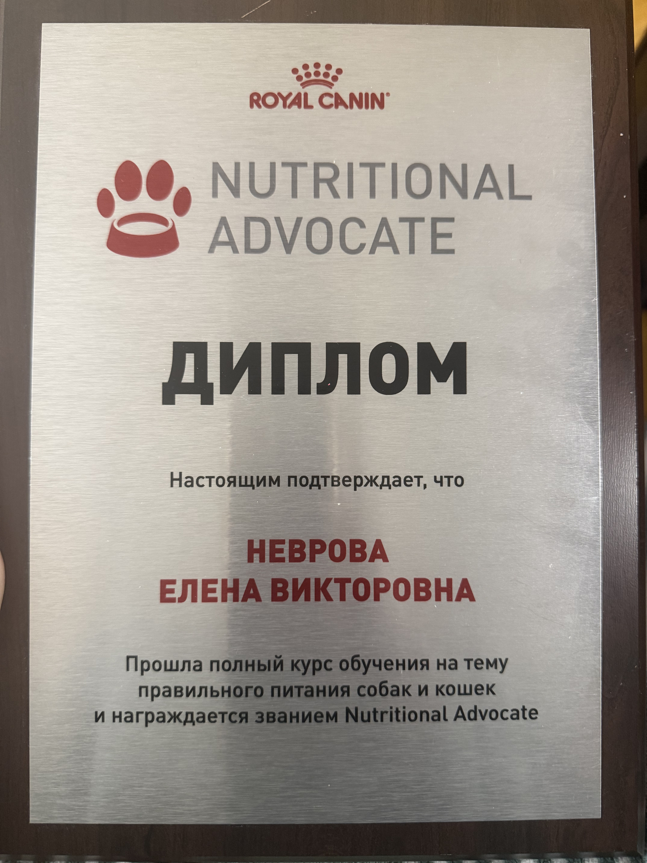 - Прошла курсы по диетологии животных «Nutrition Advocat”.