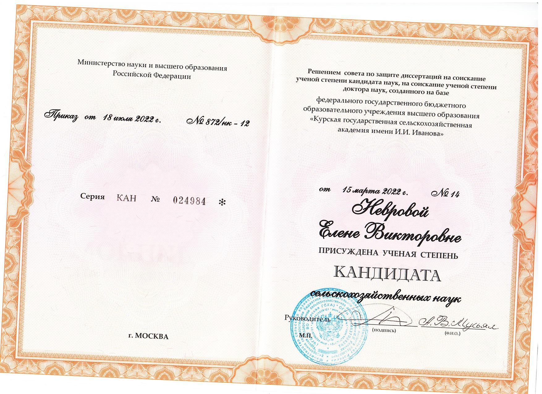 - В 2022 г. защитила кандидатскую диссертацию по направлению подготовки 06.02.10 частная зоотехния, технология производства продуктов животноводства. Присвоена степень кандидата сельскохозяйственных наук.