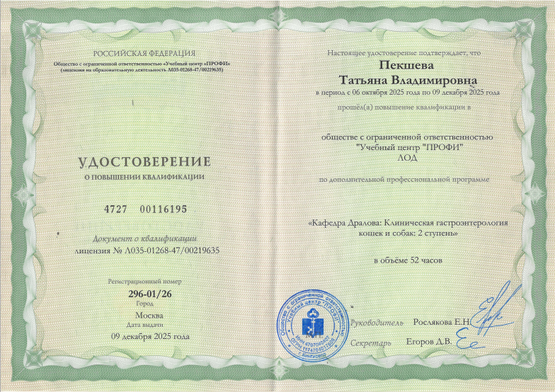 - сентябрь – декабрь) 2023 г. – Профессиональная переподготовка в ФГБОУ ВО РГАУ-МСХА имени К.А. Тимирязева по программе «Применение молекулярных и микробиологических методов и цифровых технологий в современном животноводстве».