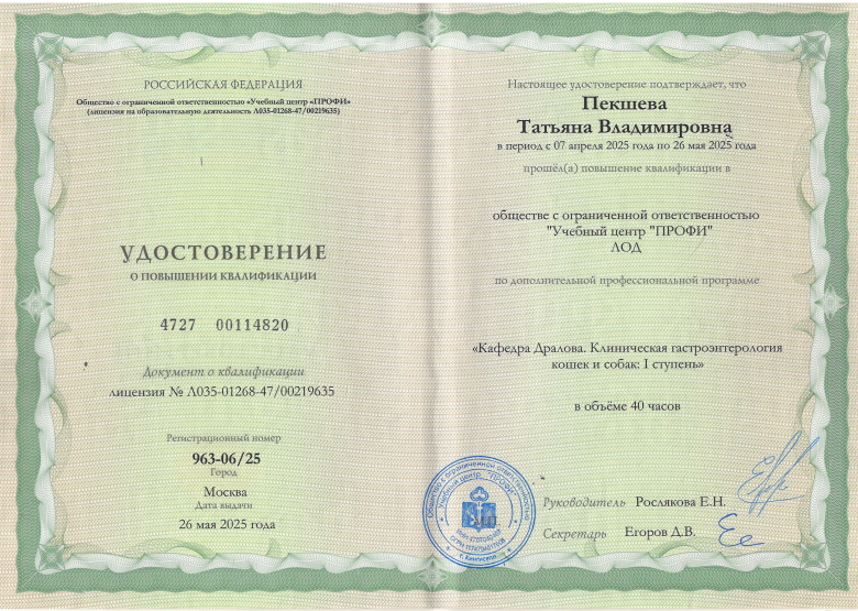 - 2022 г. – 2024 г. – ассистент ветеринарного врача-кардиолога ИВЦ МВА Восток;