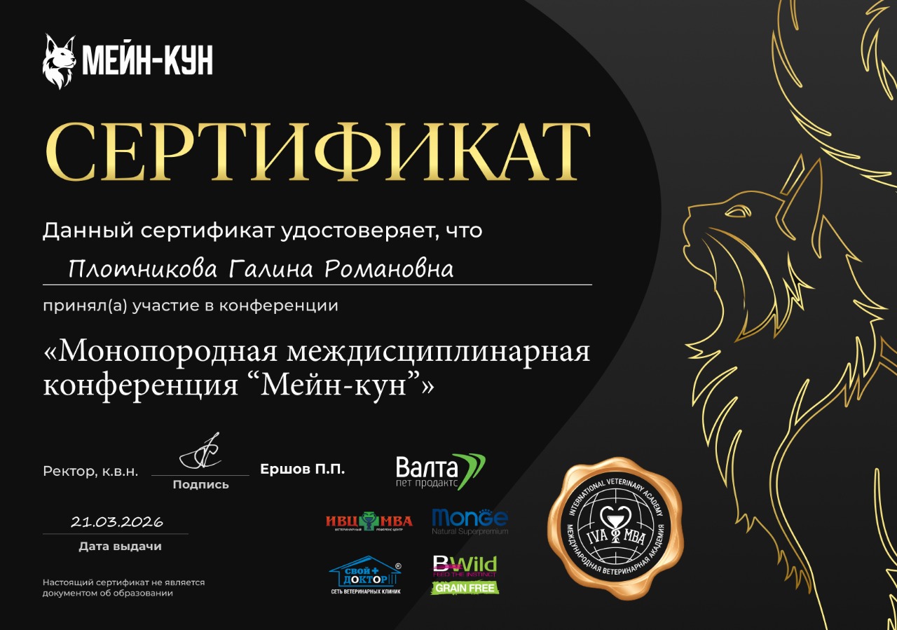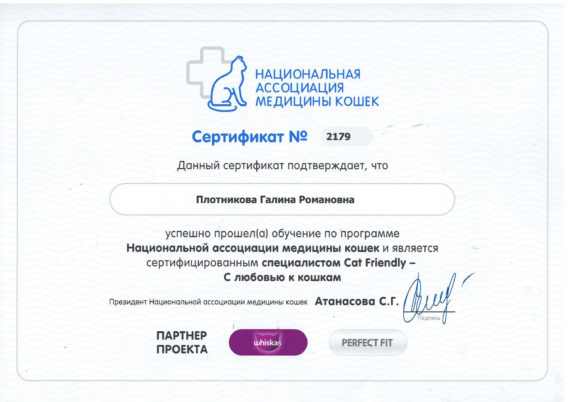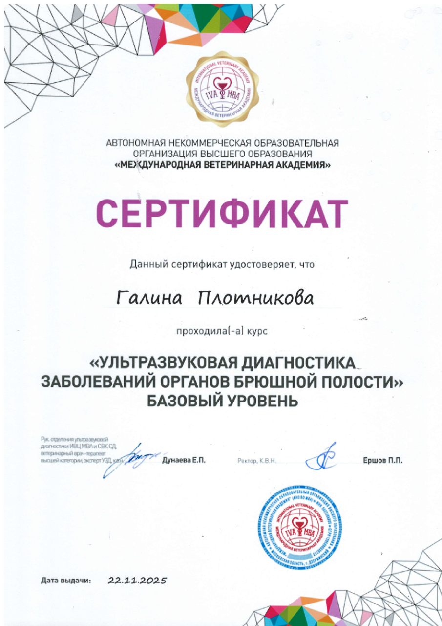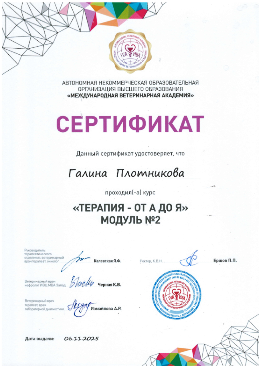 - 2022 г. - программа обучения по программе Национальной ассоциации медицины кошек