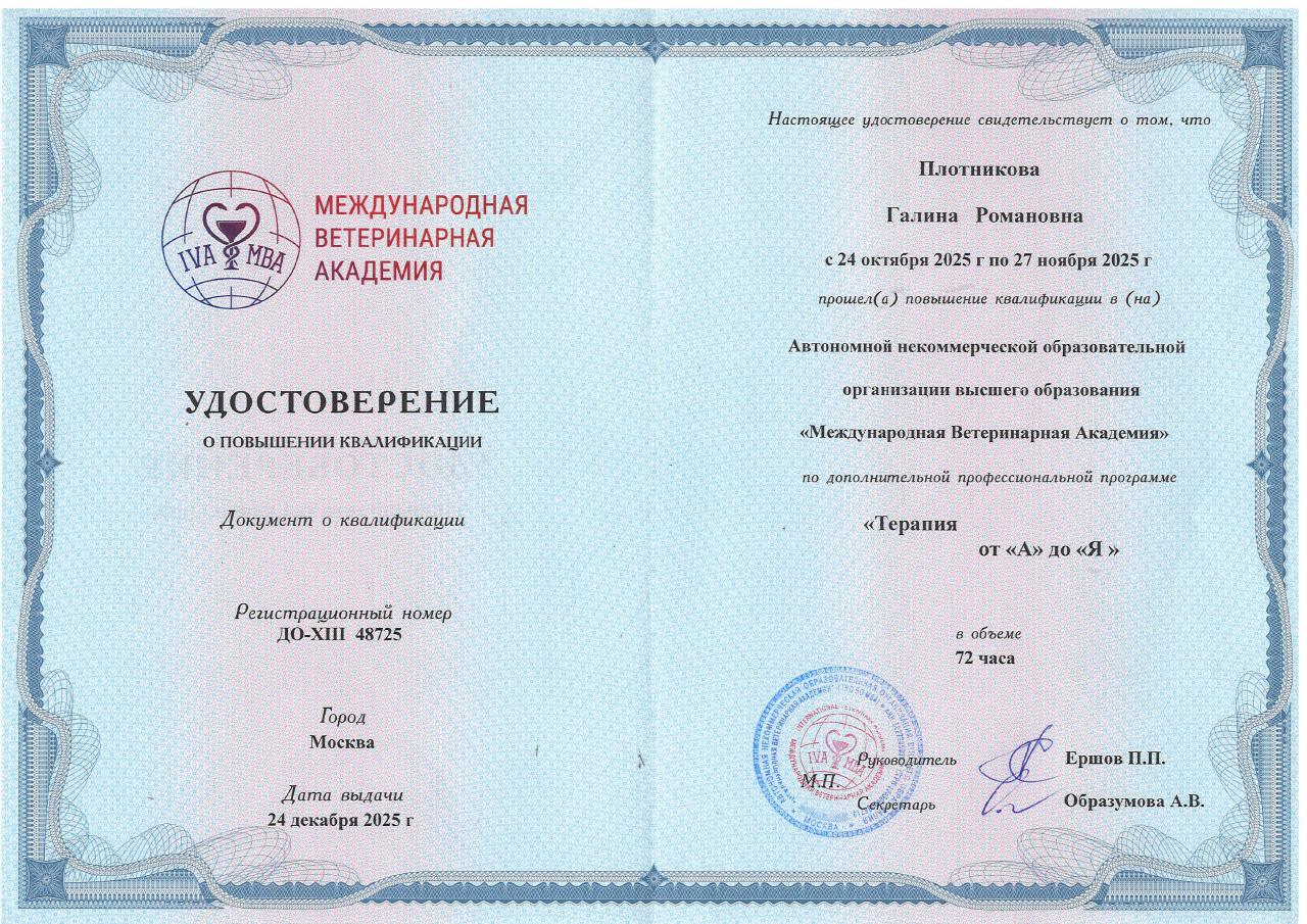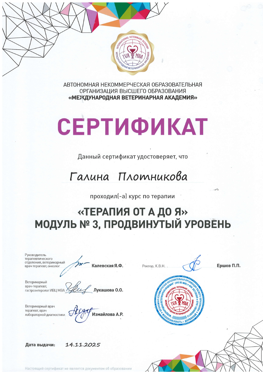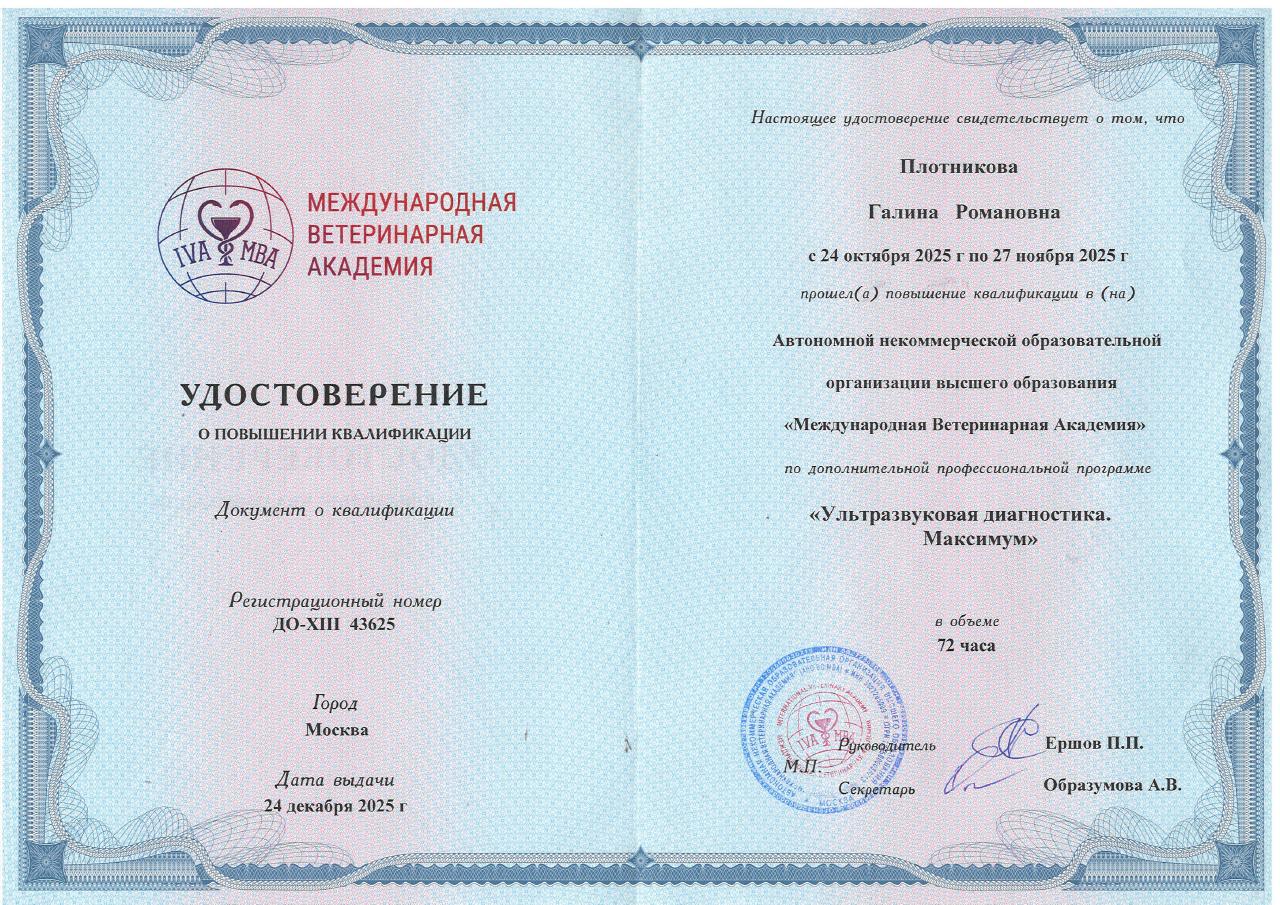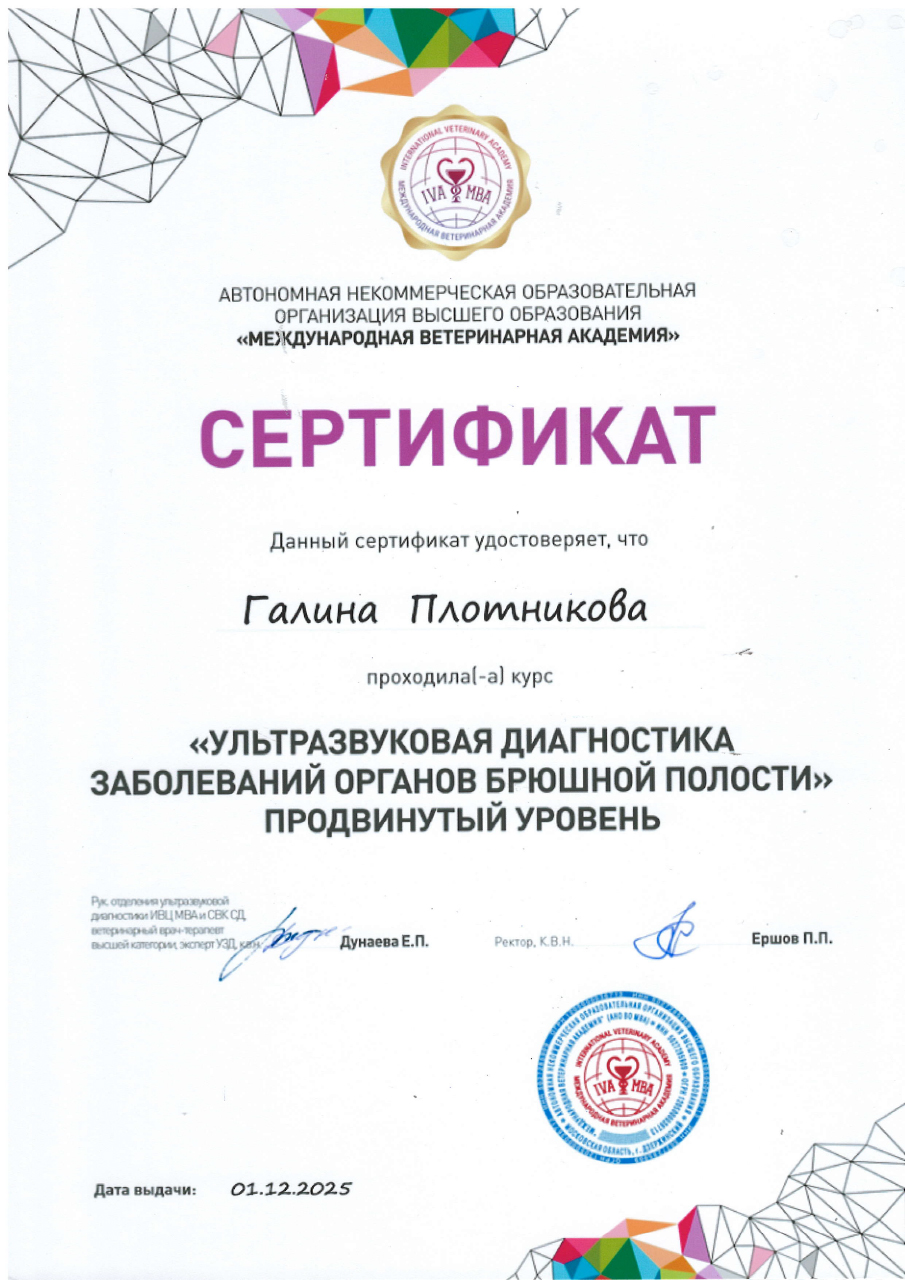 - 2022 г. - программа обучения по программе Национальной ассоциации медицины кошек