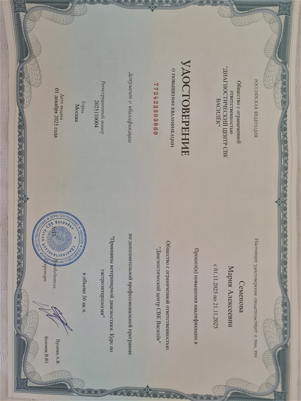- 025 г. - ООО «Диагностический центр СВК Василек», специализация «Принципы ветеринарной диагностики. Гастроэнтерология».