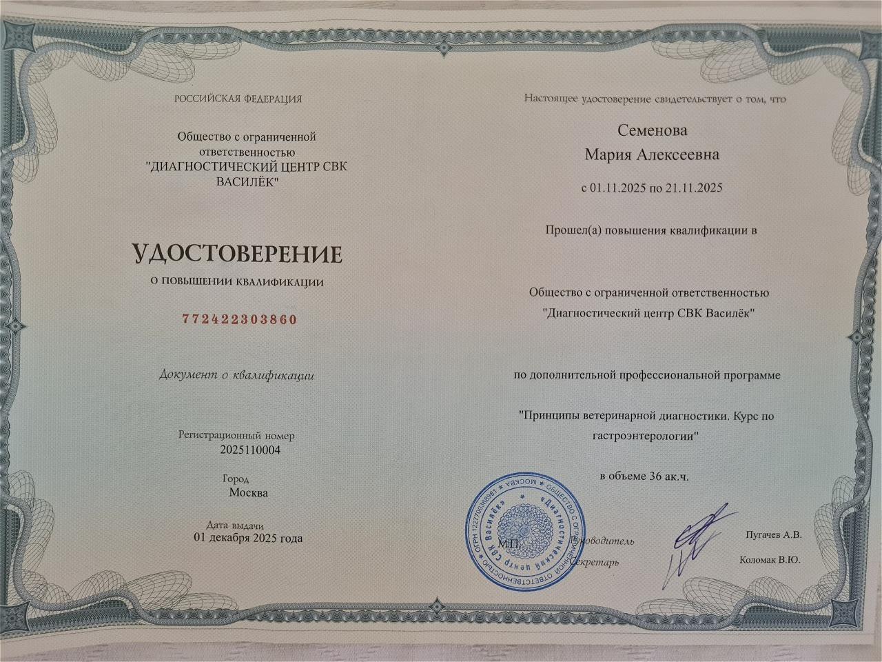 - 2021 год. Автономная некоммерческая организация дополнительного профессионального образования «Первый ветеринарный институт имени В.Н. Митина». Специализация «Базовый курс диетологии собак и кошек»;