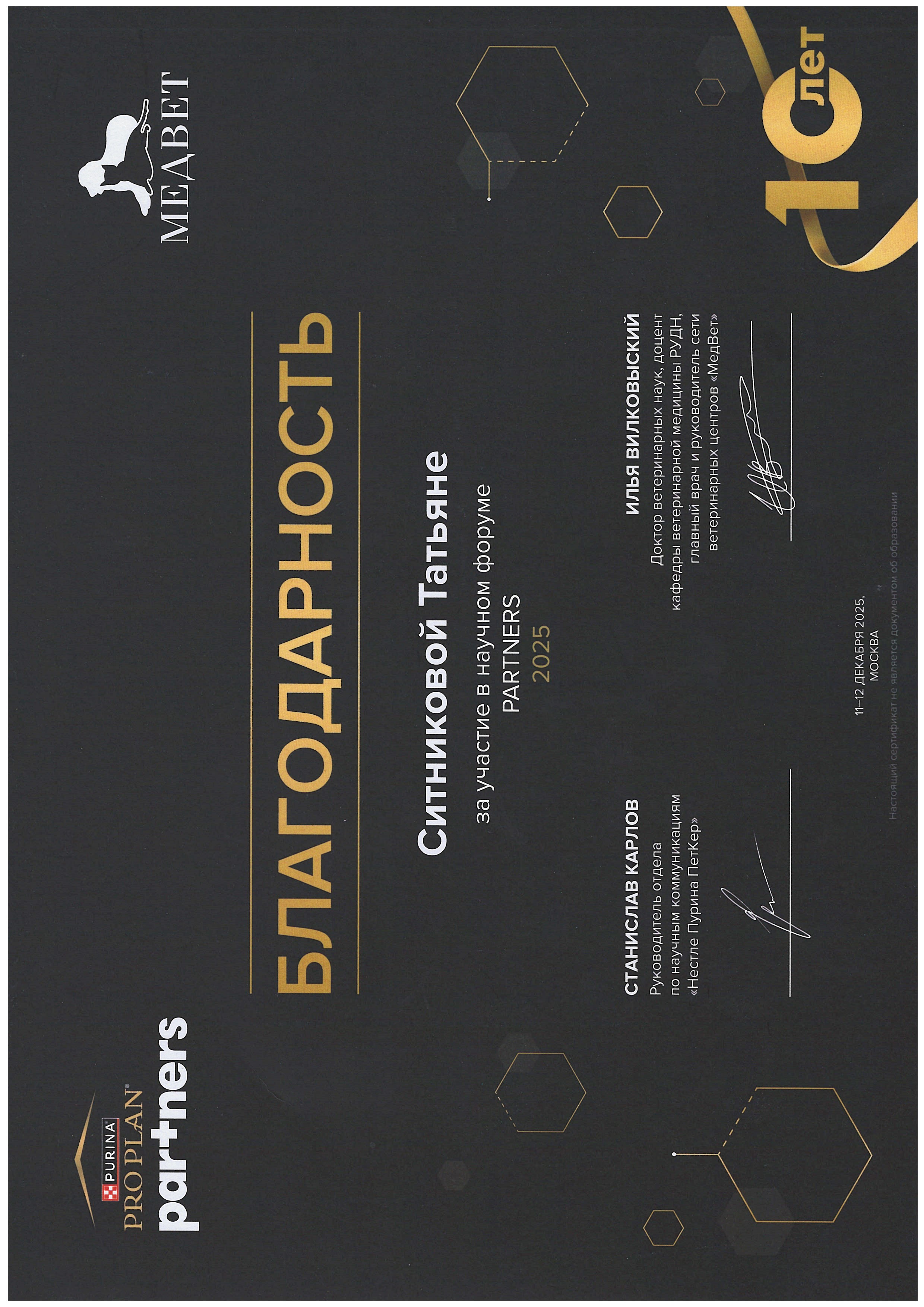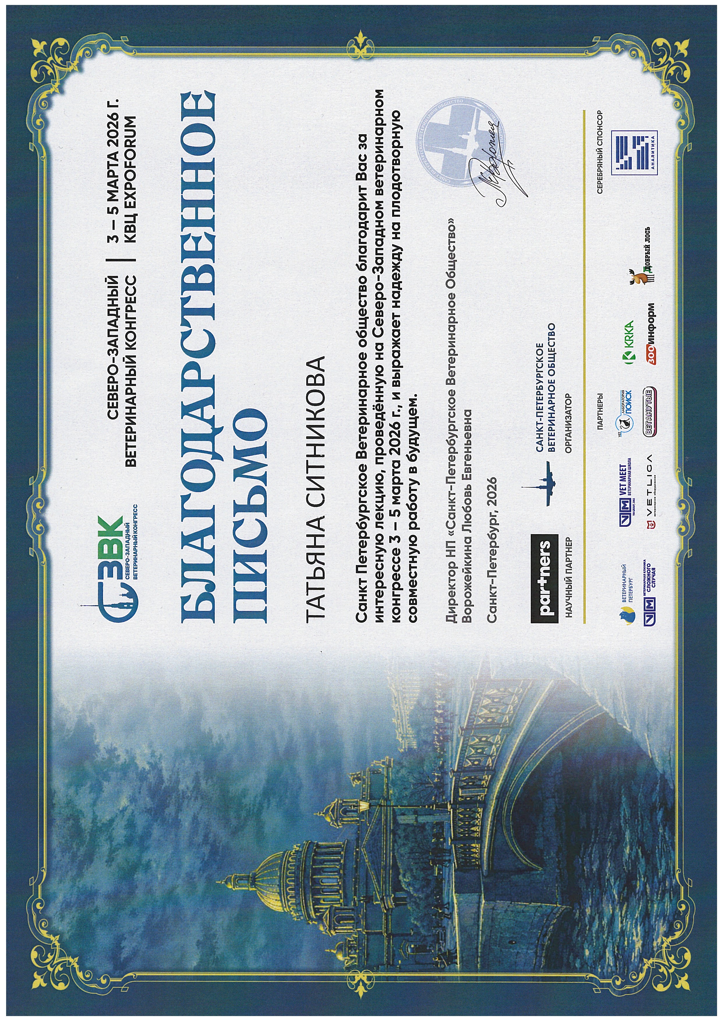 - Прошла курс «Онкология, синдромный подход» на базе образовательного центра коллегии ветеринарных специалистов.